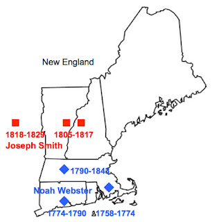 Red: The area of New England Joseph Smith grew up in and lived from 1805-1829; Blue: The area of New England Noah Webster grew up in and lived all his life 1774-1843