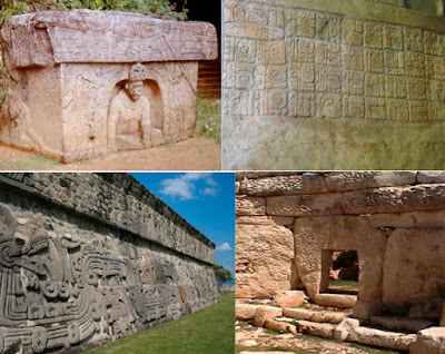 carved from a solid block stone; 2) Yaxchilan, Mayan hieroglyphs carved on a